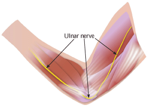 The ulnar nerve originates from the spinal cord at the neck, and it runs through the entire arm. This nerve provides sensation to the small and ring fingers and strength to the small muscles of the hand. The ulnar nerve may be compressed as it passes behind the medial epicondyle, a bony bump on the inside of the elbow. Cubital tunnel syndrome is a pathologic compression, friction or traction of the ulnar nerve in the elbow region. Symptoms may include impaired sensation of the small and ring fingers, burning pain, weak grip and clumsiness of the hand.